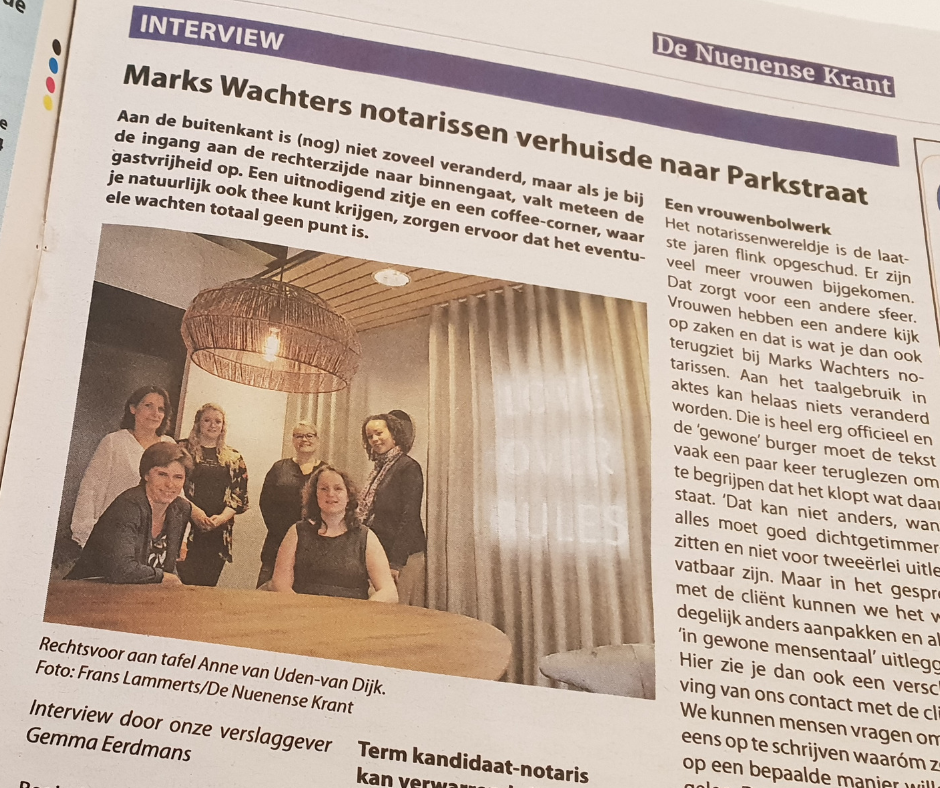 Deze week verscheen een interview met onze collega Anne van Uden - van Dijk in De Nuenense Krant. In het interview vertelt Anne meer over de verhuizing van Marks Wachters notarissen Nuenen naar de Parkstraat, het nieuwe pand en de toekomst van het kantoor.